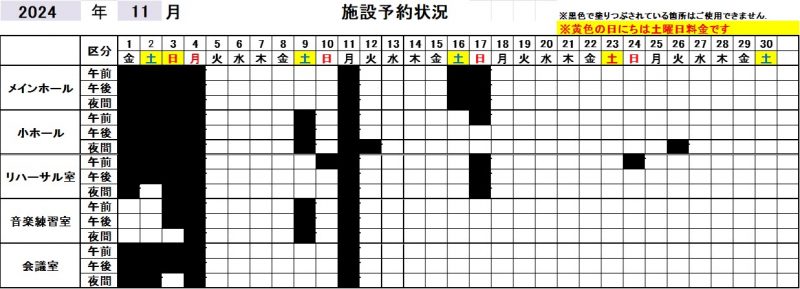 令和6年(2024年)11月分のメインホール・小ホールと、同日利用するリハーサル室、音楽練習室、会議室