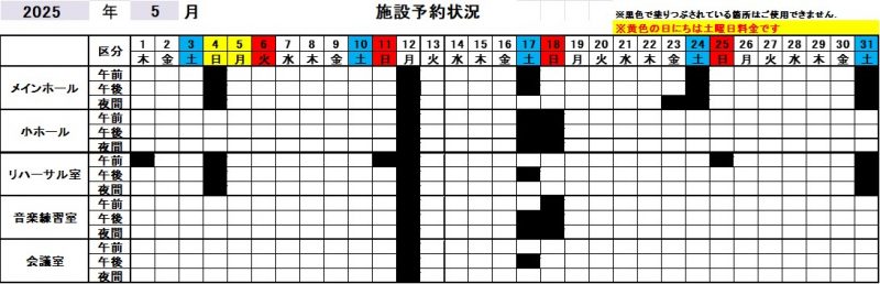 令和7年(2025年)5月分のメインホール・小ホールと、同日利用するリハーサル室、音楽練習室、会議室